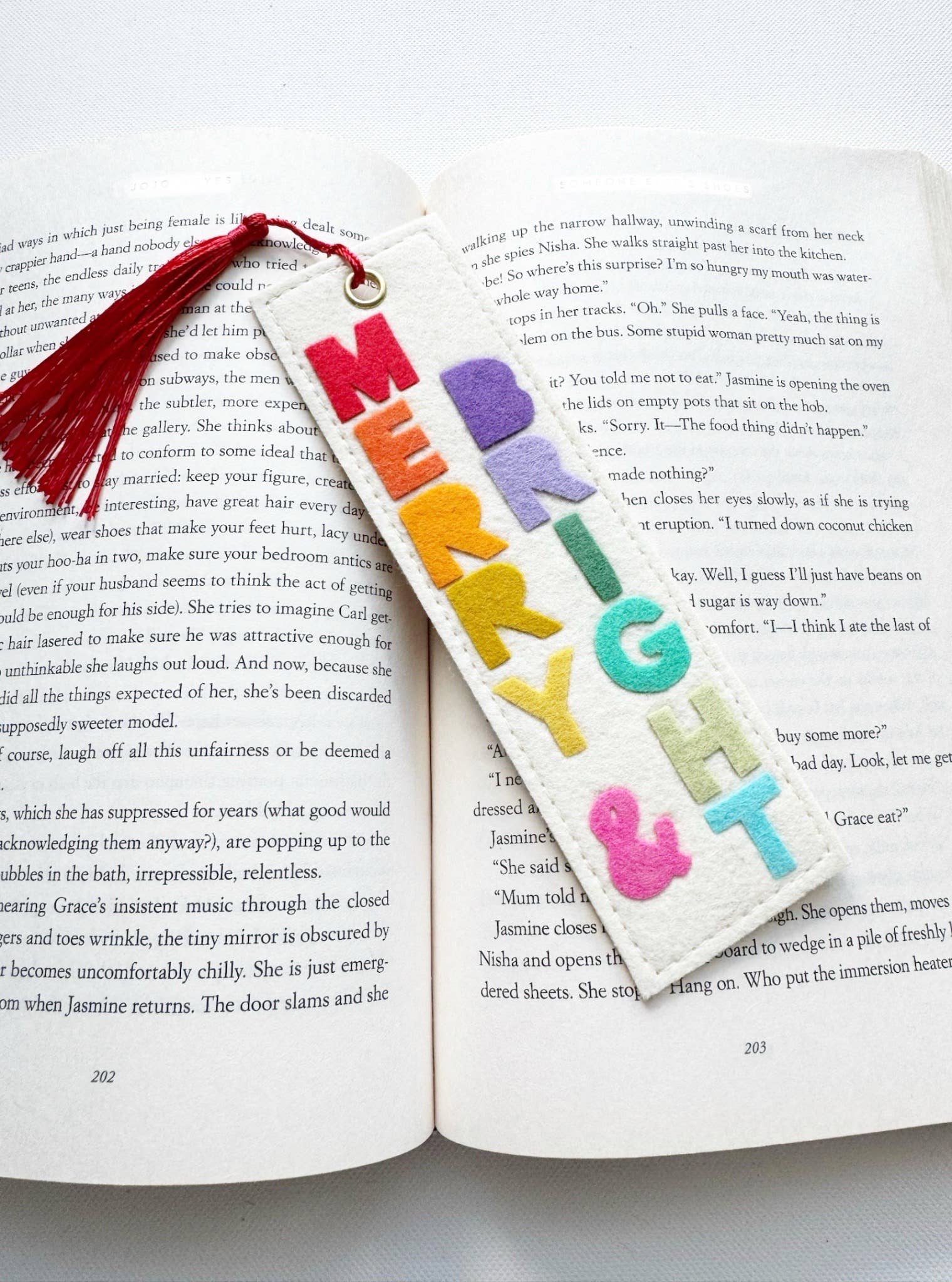 A cheerful bookmark for book lovers! Made from top-quality wool felt, this hand-cut and fused design spells “Merry & Bright” in rainbow letters. Soft yet sturdy, it keeps your place while adding a pop of festive charm. A red tassel loops through a gold brass grommet for a sweet finishing touch.